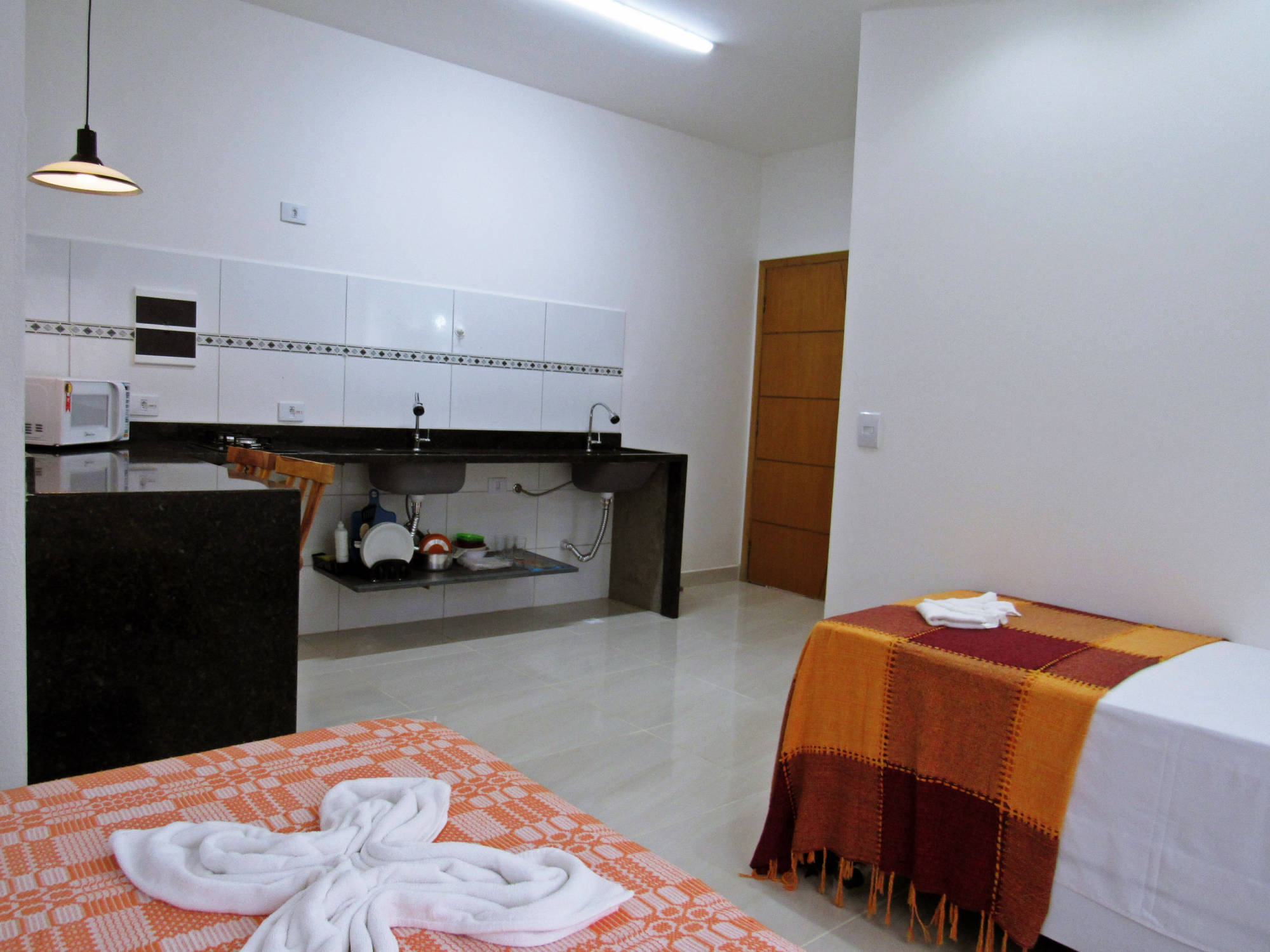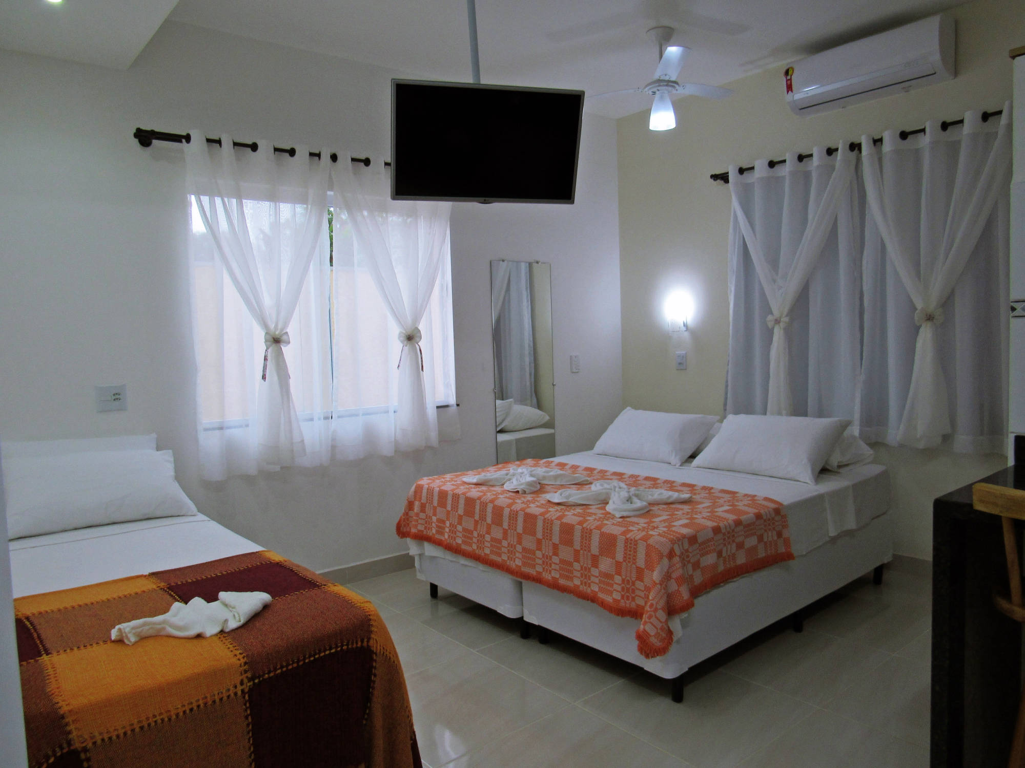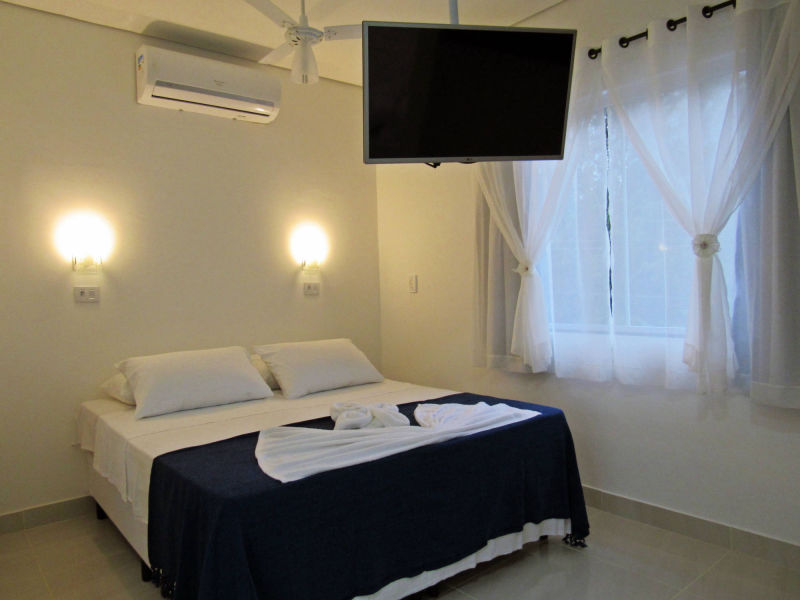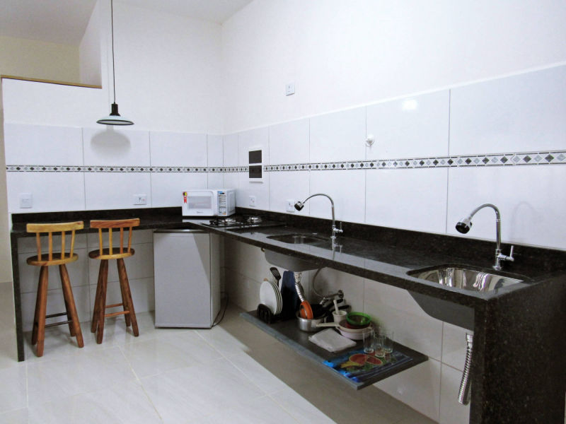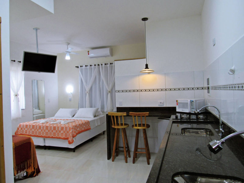 Os apartamentos Studio, são equipados com TV 360º de 32", balcão para pequenas refeições, cooktop de duas bocas, alguns utensílios de cozinha, pia, tanque, frigobar, ventilador de teto e ar condicionado de 9.000 BTUS.